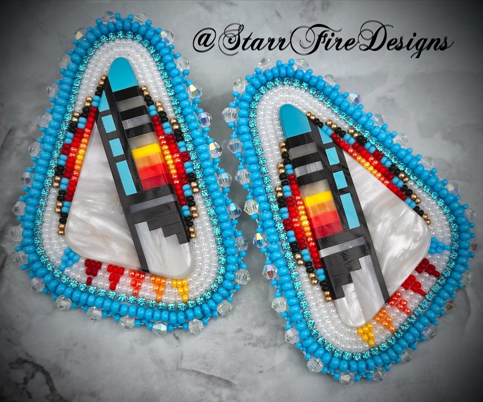 LARGE earrings beaded in a sky blue and fire color palette with Santo Domingo triangle inlay centerpieces. They are edged in glass bicone beads, are backed in smooth white vinyl, and are on hinge style post backs.