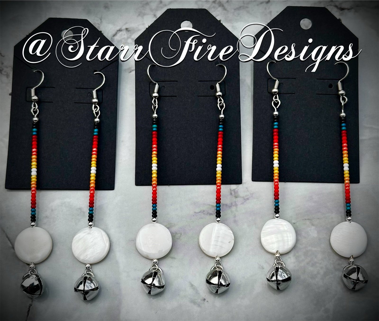 Fire color seed bead earrings accented with natural shell discs and silver bells.