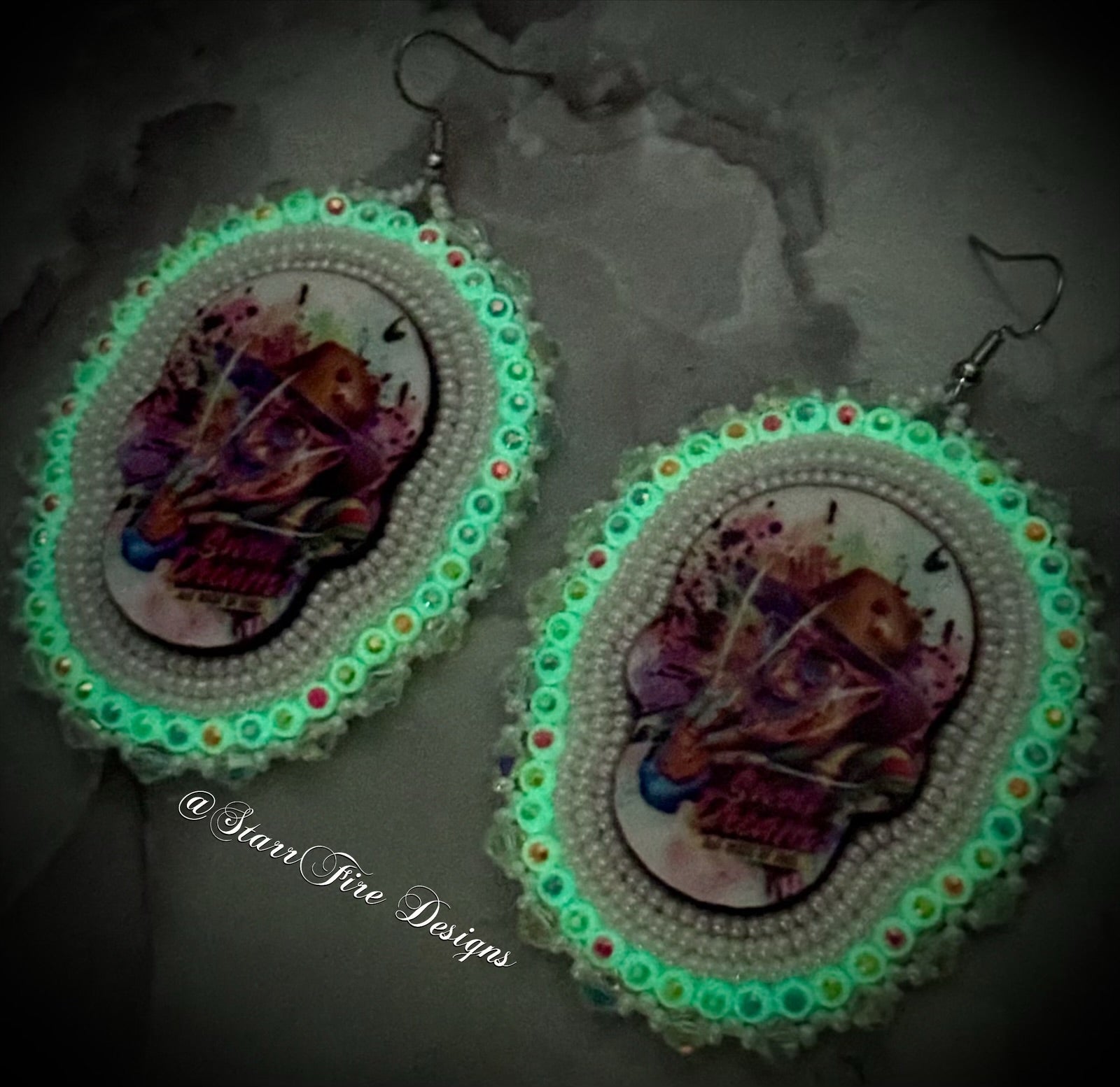 Beaded earrings with raised wooden skull shaped center pieces that depict horror legend “Freddy” with a watercolor background. They are edged in glass bicone beads, are backed in smooth white vinyl, and hang on short hooks.